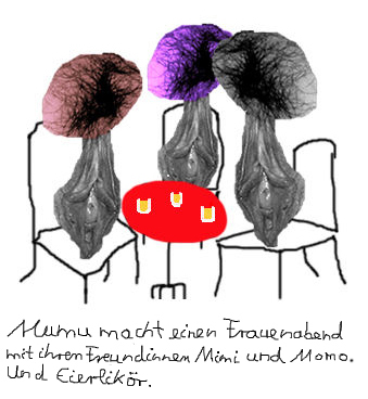 Pillemann ist ein harter Macho und schrie Mumu an, selbst wenn sie sich auf den Kopf stelle, dürfe sie nicht arbeiten außer am und hinterm Herd - doch Mumu stellte sich auf den Kopf (für das Fotoshooting) und setzte diesen auch durch, so dass man nun ihre leckeren Aubergienen in Dosen in jedem türkischen Geschäft kaufen kann. Immerhin.